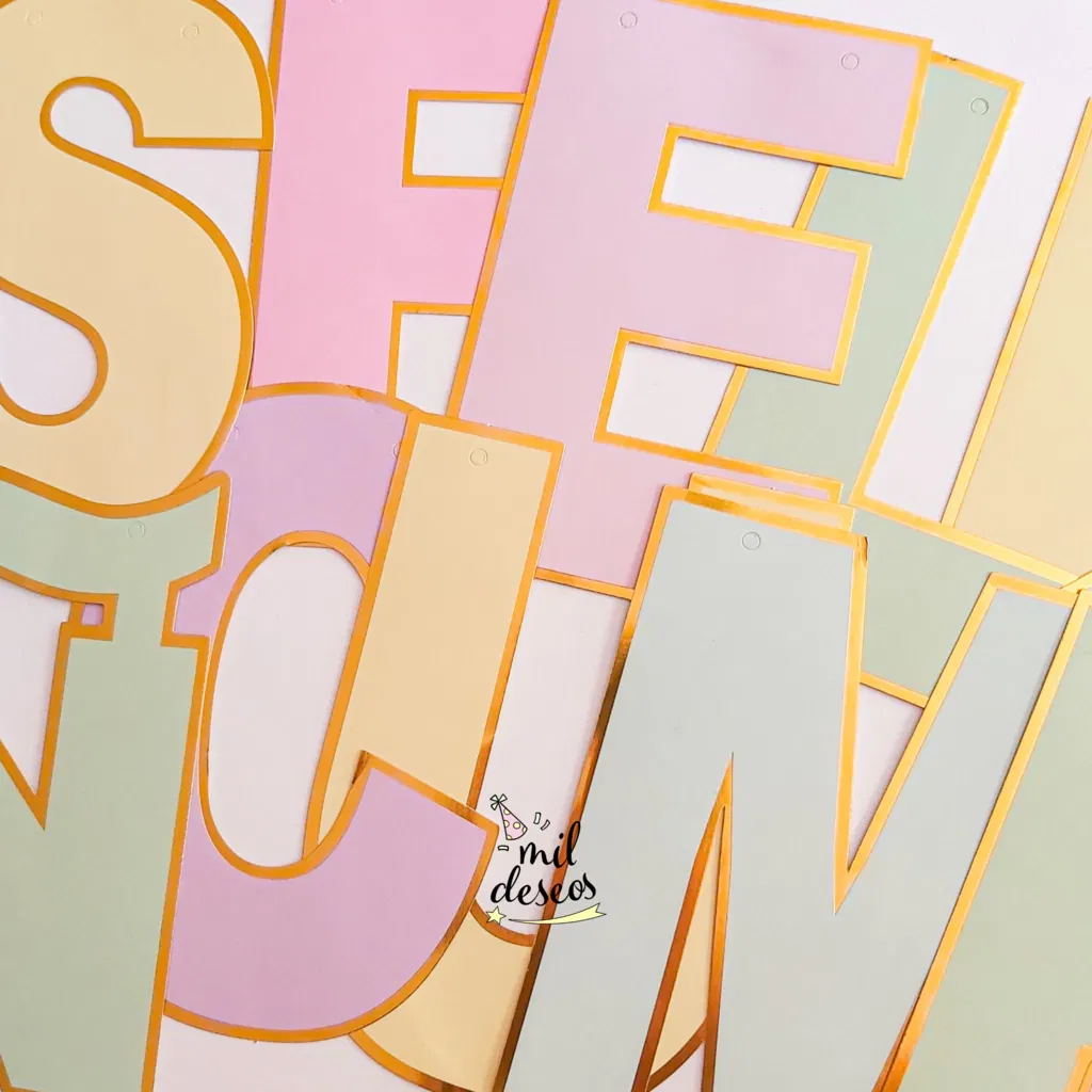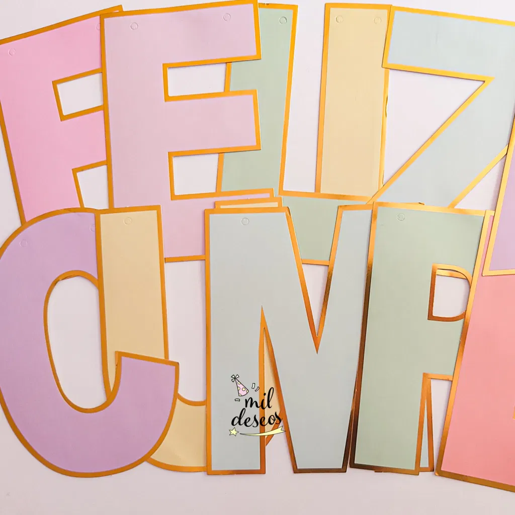 Banderín "feliz cumpleaños" pastel con contorno dorado