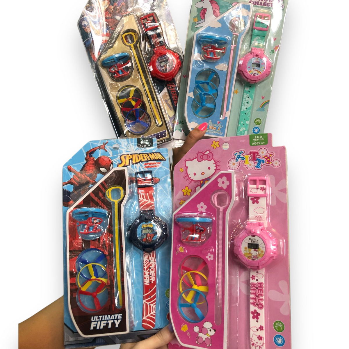 Reloj infaltil personajes con mini helicoptero a cuerda en blister surtido