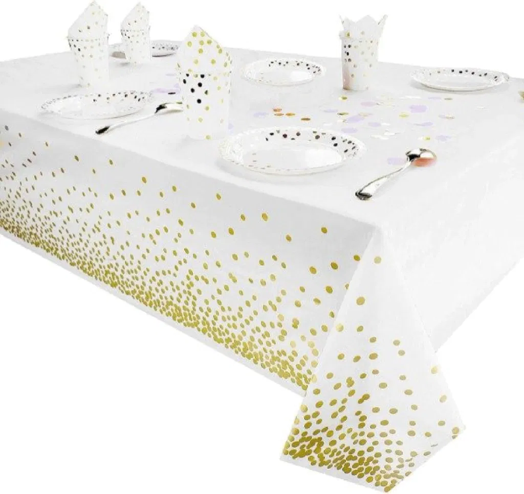 Mantel plástico ROSA GOLD CON LUNARES DORADO 1,37x 2.74m