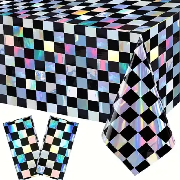 Mantel metalizado cuadritos negros y plateados 137 x 183mts