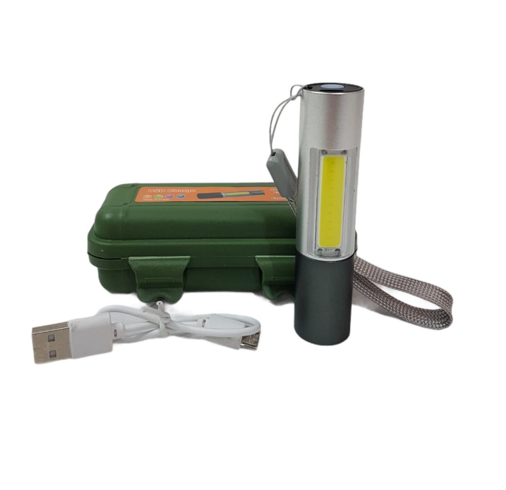 Linterna recargable 10cm PLATEADA caja verde etiqueta naranja -A1501-
