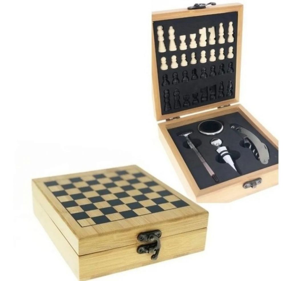 Set de vino con piezas y tablero de AJEDREZ en caja blanca (643-16)