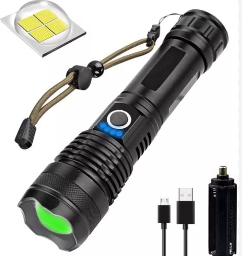 Linterna recargable USB P50 LUZ VERDE en caja azul y blanca