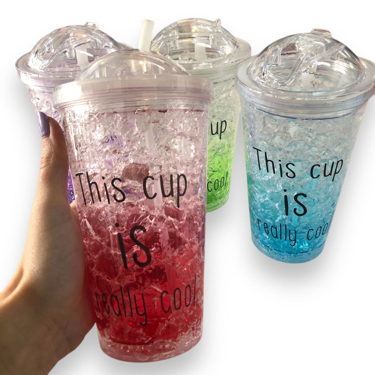 Vaso acrílico FRASE doble pared con gel y pico de silicona en caja blanca